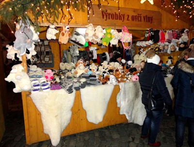 A koło nich, świątecznie oświetlonych, ustawiono w kilku grupach po parę – kilkanaście drewnianych kramów, w których oferowane są świąteczne i przedświąteczne artykuły. Dominują regionalne. Spożywcze, zwłaszcza wędliny, sery i inny nabiał, pieczywo, różnorodne napoje od bezalkoholowych po wina i nalewki.