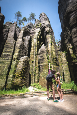 *Skały Prachovskie (16 km). Niezwykłe trasy turystyczne wśród skał. Spacer najlepiej rozpocząć z miejsca Dolni pokladna (Dolna kasa), przy schronisku Turisticka Chata (restauracja, latem możliwość zakwaterowania).
