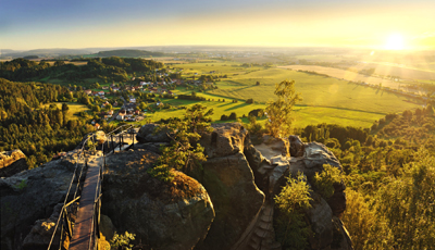 *Krásna Lípa (8 km). Wypożyczenie rowerów elektrycznych i wycieczka w kierunku doliny Kyjovské údolí do miejscowości Hinterhermsdorf w Niemczech. Wejście na wieżę widokową Weifberg, skąd rozciąga się piękna panorama Szwajcarii Saksońskiej.