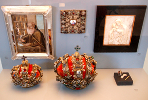 Na piętrze natomiast, z oszklonymi arkadami, eksponowane są relikwiarze, obrazy, rzeźby o tematyce religijnej, niezliczone cenne wota – głównie dzieła artystów – złotników. A także monstrancje i inne akcesoria religijne. Najcenniejsze, jak słynna Diamentowa Monstrancja wykonana w Wiedniu w XVIII w, wysadzana 6222 diamentami, w specjalnej pancernej szafie za kuloodpornym szkłem.