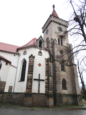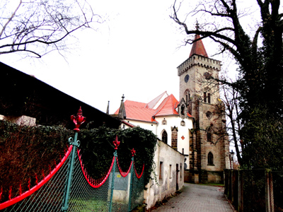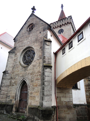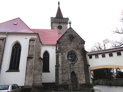 Z parkingu do pałacu prowadzi dróżka obok zabytkowego kościoła św. Marcina z XIV w, przebudowanego w stylu neogotyckim w latach 1891-1892, połączonego z nim na wysokości piętra murowanym, zakrytym korytarzem. To nie pierwsze w Czechach takie przejście jakie widzę, ułatwiające „wielmożnym” przechodzenie z domu do świątyni na modły bez konieczności wychodzenia na zewnątrz, a i w niej kontaktu z „plebsem”.