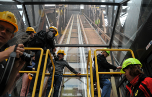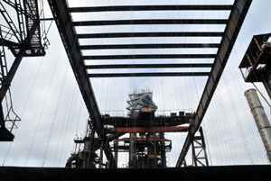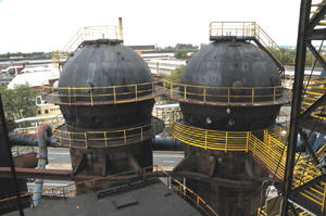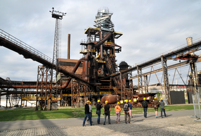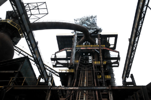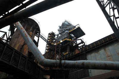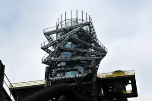 Po obejściu i obejrzeniu wszystkich obiektów wjeżdżamy specjalną windą po pochylni na wielki piec nr 1, a następnie wchodzimy na jego szczyt, na którym nadbudowano niedawno Bolt Tower.