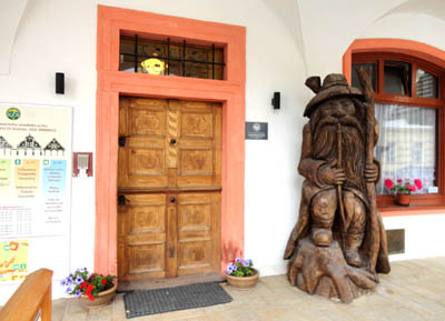 Przed drzwiami tego drugiego, mieszczącego się w „starym” ratuszu, stoi w podcieniach duża, drewniana rzeźba Krkonoša, Ducha Gór, nazywanego u nas Liczyrzepą. Postaci, którą w Czechach znają dzieci i dorośli, gdyż występuje w bajkach, opowieściach, książkach i filmach.