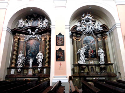Wszystkie są godne uwagi, ale za najcenniejszy artystycznie uważany jest ołtarz św. Krzyża w prawej nawie, z rzeźbami Jana Franciszka Pacaka, ucznia i pomocnika sławnego rzeźbiarza Matyáše Bernarda Brauna. Strop nawy pokrywają freski ze scenami z życia św. Augustyna.