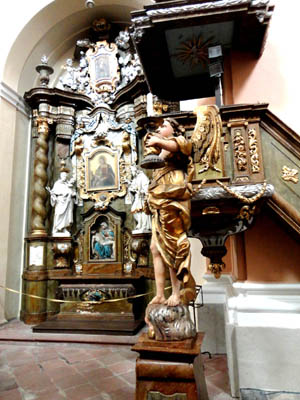 Wcześniej znajdował się on w kaplicy św. Anny dobudowanej w roku 1749 do starego kościoła. Uwagę zwraca też ambona, ale szczególnie cenne są organy w bogato zdobionej obudowie drewnianej. Zbudowano je , w roku 1889, jako 240-te, w słynnej firmie braci Riegów.