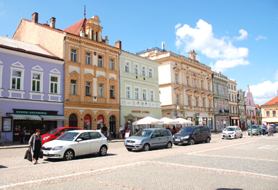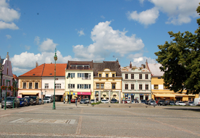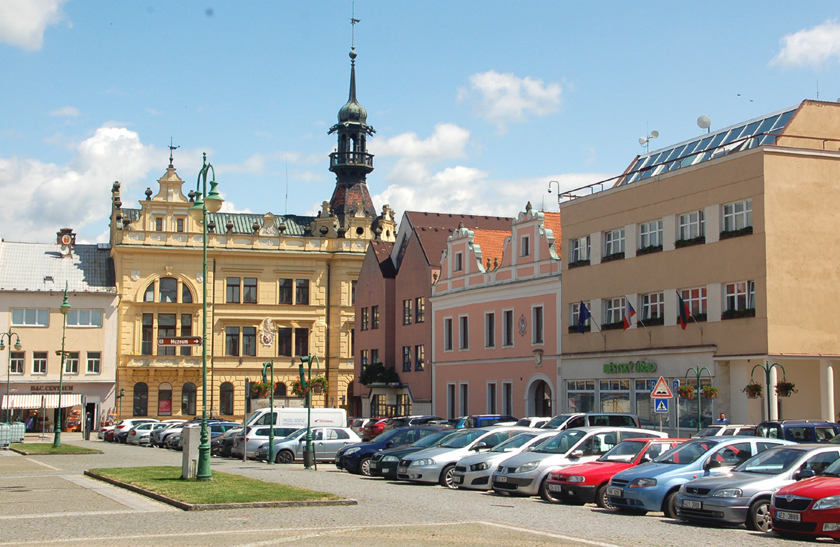 Z nadal największym w Czechach, 2-hektarowym kwadratowym rynkiem, z którego odchodzi 12 ulic.Po dwie z każdego narożnika i po jednej po środku pierzei.