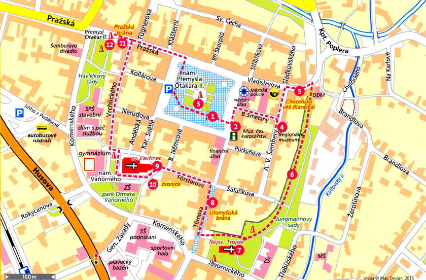 M.in. (nazwy tłumaczę): Historia i pomniki. Polecane poznawanie miasta. Kościoły. Wieże, bramy, fortyfikacje. Miejskie parki i ogrody. Cmentarz. Ścieżki rowerowe. Muzeum czeskiego karosernictwa. Niektóre są jednak również w językach: angielskim i niemieckim, a także polskim.