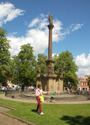 Stoi przy nim kilka zabytkowych kamienic, a przede wszystkim, na zielonym skwerze po środku, kolumna maryjna z rzeźbą NMP na szczycie oraz św. św. Jana Nepomucena, Józefa, Floriana i Wawrzyńca na dole. Jeżeli chodzi o bezpłatne wydawnictwa, głównie foldery, zachęcające do zobaczenia poszczególnych miejsc, zabytków i obiektów, to w Centrum Informacyjnym (IT) w Wysokim Mycie znalazłem ich wyjątkowo dużo. Wydawane są ze wsparciem środków unijnych, głównie po czesku.