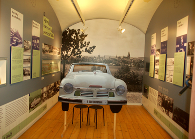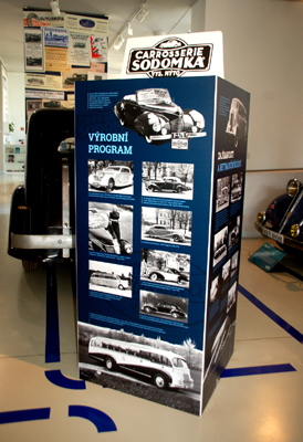 I cały proces, od projektu konstrukcyjnego, kolejnych planów i etapów jego wdrażania, aż po gotowy samochód. Obejrzeć można również, na parterze i piętrze dawnego ratusza, w sumie kilkadziesiąt oryginalnych pojazdów Carrosserie Sodomka. M.in. kabriolety Aero 50 Dynamik, Praga Piccolo, Horch 853, MG Midget 850, Tatra 75, Halter 48.