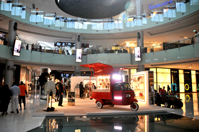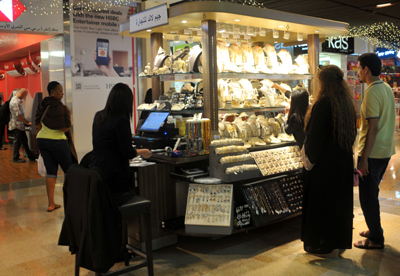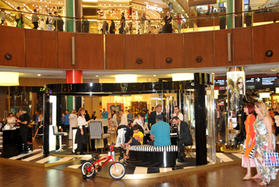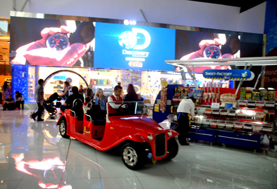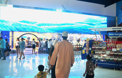 A obok ludzi o wyglądzie Europejczyków. Także pań i panów w szortach i lekkich bluzkach lub T-shirtach. Wiele tutejszych salonów i sklepów jest tak wizualnie atrakcyjnych, że nie sposób przejść obok nich bez zrobienia zdjęcia. Mnóstwo zainteresowanych przyciąga m.in. salon Discovery Chanel z ogromnym, długim na kilkanaście metrów ekranem na górze, na którym wyświetlane są filmy. Np. fal morskich nadpływających tak realistycznie, że w pierwszej chwili chce się… od nich uciekać. Zaś w szklanej, dosyć wąskiej ścianie oddzielającej ten salon od szerokiego korytarza z ruchem pieszych, pływają ryby.