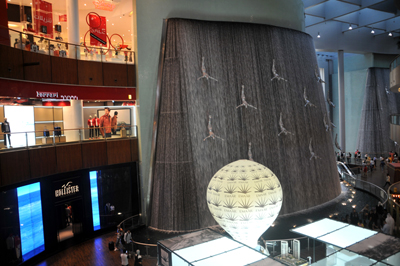 Niestety jesienią, gdy zaczyna się szczyt sezonu turystycznego, bo w lecie jest w Dubaju zbyt gorąco, przeważnie z górnymi częściami w chmurach, lub też w całości zamglonego. W ciągu tygodniowego pobytu w Dubaju nie udało mi się go, z tego powodu, sfotografować należycie. Wnętrza handlowe DM, to kilka pięter z szerokimi galeriami po bokach. W sumie chyba kilometrami do pokonania, o sterylnie czystych posadzkach. Do dyspozycji tych, którzy mają problemy z chodzeniem na takie odległości, są także, poza systemem wind i ruchomych schodów, chyba odpłatnie, ale tego już nie sprawdzałem, elektryczne samochodziki i „pociągi” ciągnięte przez „lokomotywy”.