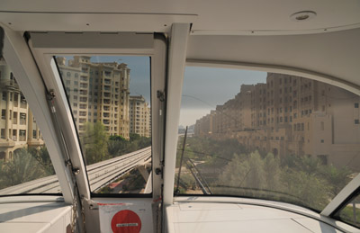 Wygodniej jest więc wsiadać w te, które już ją przejechały. Na Palm Jumeirah można wjechać taksówką, autobusem panoramicznym lub jakimkolwiek samochodem. Ale także naziemną koleją jednoszynową na estakadzie opartej na słupach.