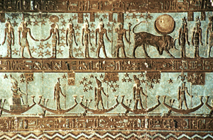 To z tej sali kapłani wchodzili w dniu święta Nowego Roku na dach, aby w małej kaplicy postawić posąg bogini. W dwu kaplicach boga Ozyrysa stojących również na tym dachu, przedstawiono odradzające się życie. Najpiękniejsze, fantastycznie zachowane płaskorzeźby pokrywają pomieszczenia krypt. Był to cały system tajemnych przejść i schowków, w których przechowywano cenne przedmioty kultowe.