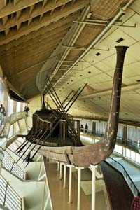 W jego wnętrzu znajduje się, zrekonstruowana w ciągu 14 lat (!) przez Ahmada Youssufa, Łódź Słoneczna Cheopsa. Ma ona 43 m długości i 5 m szerokości oraz kilkumetrowej wysokości dziób, zakończenie rufy oraz wiosła. Można ją oglądać ze specjalnej wewnętrznej galerii. Fotografowanie tego zabytku i w ogóle wnętrza muzeum jest zabronione.