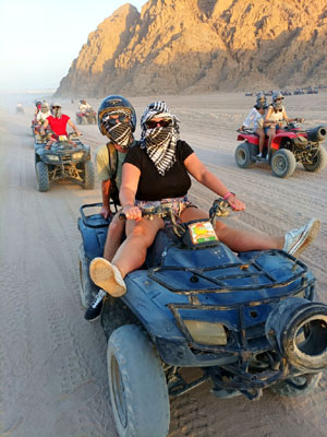Ale żeby nie było zbyt sterylnie, po dużą dawkę kurzu i hałasu można wybrać się quadami na pustynne moto safari. Nie, nie ma tam miejsca na podziwiania dzikich zwierząt, tylko jazda na quadach po wytyczonej, pustynnej trasie. Mnóstwo quadów jedzie to w jedną to w drugą stronę. Jest kurz, warkot silników i niezła zabawa podczas jazdy drogą jak tarka pośród ciemniejących w zapadającym zmierzchu gór. Jedzie się samemu lub we dwójkę, a każda z grup jest pod opieką organizatorów moto safari.