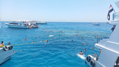 Wczesnym przedpołudniem do Wataneya Port zjeżdżają liczne autokary. W gęstniejącym tłumie przemieszczamy się do poczekalni, skąd kolejne grupy otrzymują swojego opiekuna. Każdy dostaje maskę, płetwy i ruszamy na „nasz” statek. I lepiej pilnować się przewodnika dopóki nie wejdziemy na pokład statku, na którym już nie ma tłoku. Jest tych statków kilkanaście, a może nawet kilkadziesiąt. Odpływamy. Po drodze czekają nas co najmniej trzy przystanki na nurkowanie, snorkeling lub tylko pływanie w przyjemnie ciepłych wodach Morza Czerwonego.