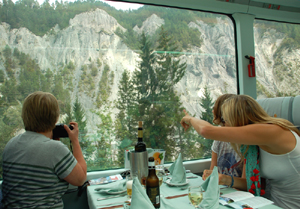 Bo wybrać się można także tylko na któryś z jej fragmentów. W lecie w obie strony kursują na tej trasie po 3 pary pociągów, w tym dwa z wagonami panoramicznymi: dwoma wagonami 1 klasy z 32 miejscami pasażerskimi, trzema 2 klasy o 48 miejscach oraz wagonem restauracyjnym. W trzeciej parze jest tylko jeden wagon 2 klasy.