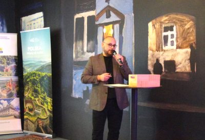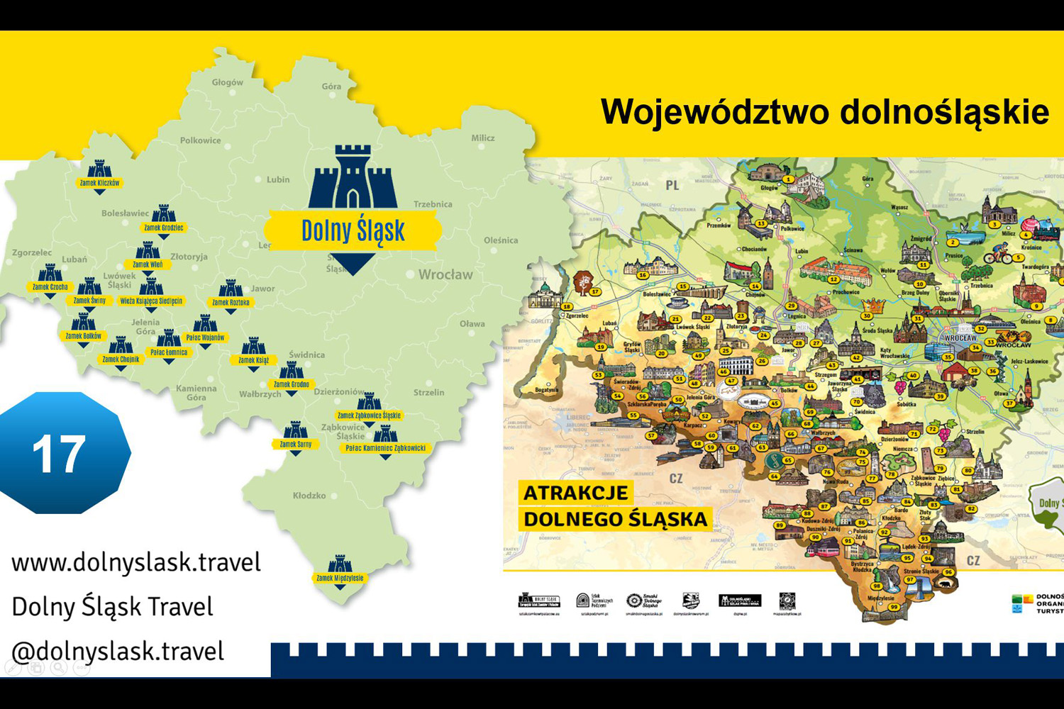 „Atrakcje Dolnego Śląska” z zaznaczonymi na niej z numerami i osobno krótko opisanymi 116 zabytkami i wartymi poznania miejscami, również takimi jak np. jaskinie, masywy górskie, wodospady, muzea, wieże widokowe, zabytki sakralne itp. Świetna inicjatywa. Tym bardziej, że ogromną większość tych miejsc można zwiedzać i poznawać przez cały rok, a nie tylko w sezonie od wiosny do jesieni. Konferencję zakończyła „loteria wizytówkowa” – losowanie wśród uczestników 6 upominków, głównie jednodniowych pobytów w zamkach i pałacach z zapewnionym ich zwiedzaniem.