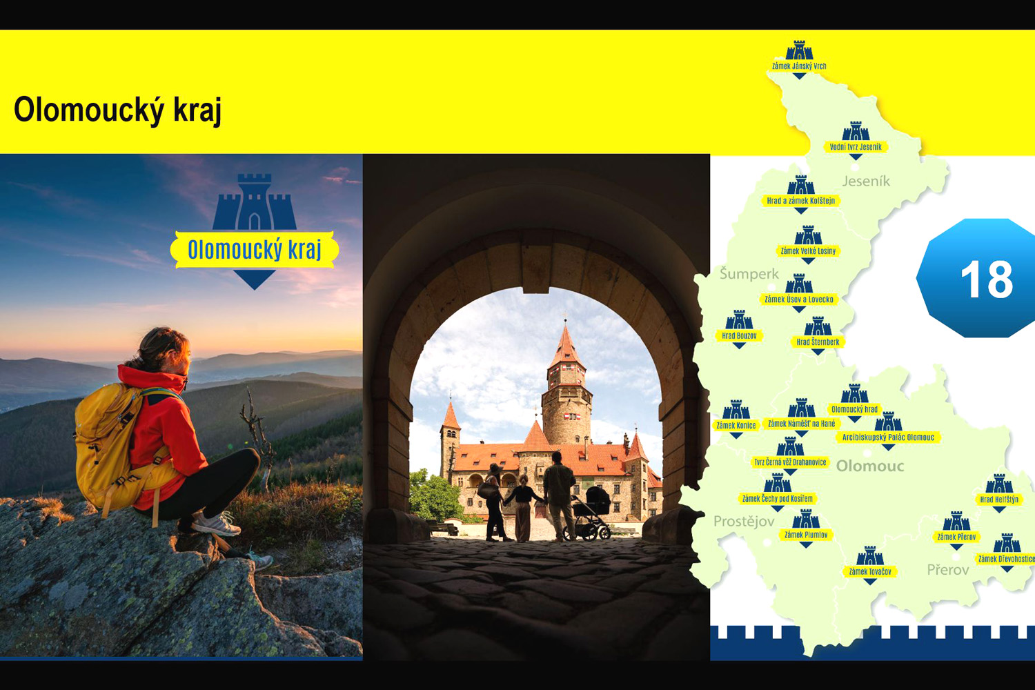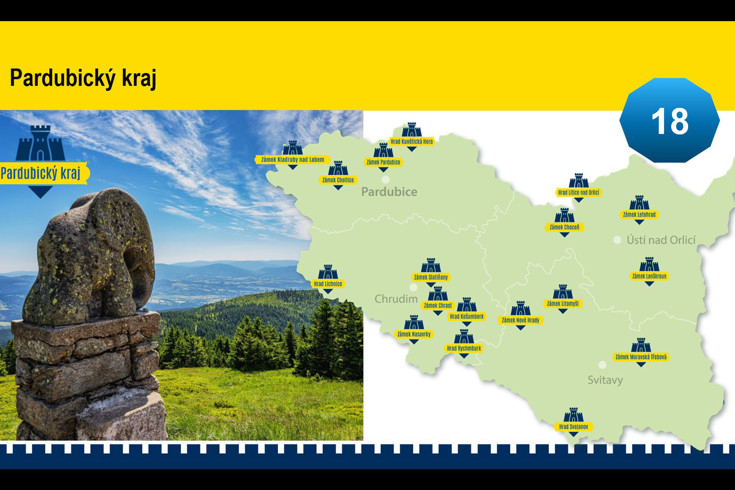W Kraju Pardubickim z 18, 5 zamków: Pardubice, Kunĕticka Hora, Kladruby, Litomyšl i Rychmburk. W Kraju Olomouckim, również z 18, pałace: Bouzov, Helfštýn, Jánsky Vrch i Velke Losiny oraz Pałac Arcybiskupi w Ołomuńcu. Natomiast z 17 w woj. Dolnośląskim zamki: Książ, Grodziec i Czocha oraz pałace Kamieniec Ząbkowicki i Łomnice. Ten przegląd pokazał uczestnikom prezentacji, jak wiele wspaniałych zabytków architektury znajduje się na tym szlaku. A to dopiero początek, gdyż przygotowywane jest rozszerzenie go na zachód i stworzenie gałęzi Polska – Saksonia. Sądząc z przedstawionych mapek, z czasem również na teren Słowacji.