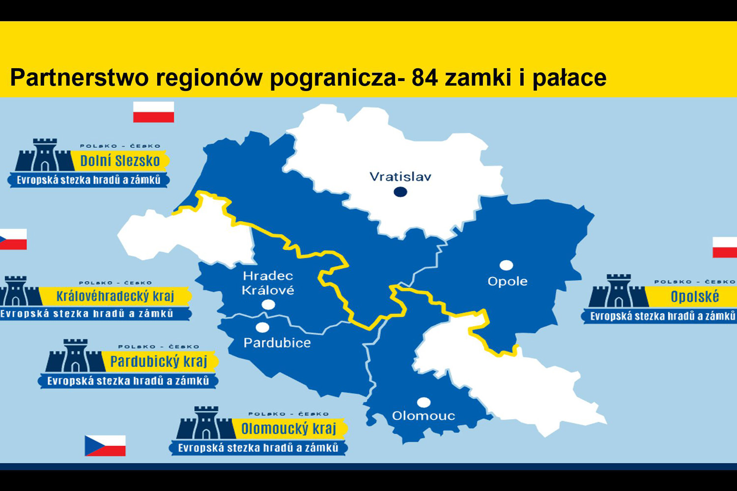 Od dwu lat dwa województwa polskie: Dolnośląskie i Opolskie oraz trzy, położone po południowej stronie granicy, czeskie nazywane krajami: Kralovohradecký, Pardubický i Olomoucký realizują z dużym powodzeniem, przy wsparciu środków z Unii Europejskiej, program Interreg: „Polska – Czechy Europejski Szlak Zamków i Pałaców”. Dotychczasowy dorobek i zamierzenia na najbliższą przyszłość przedstawiły one na konferencji prasowej w Warszawie.