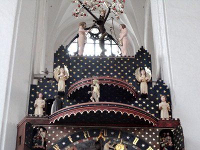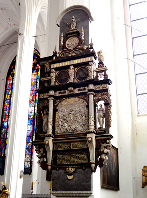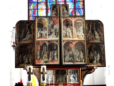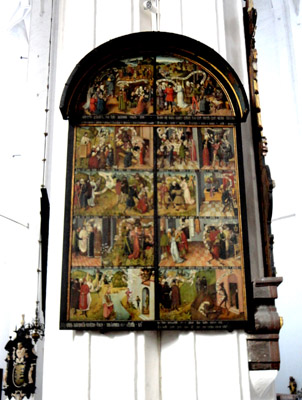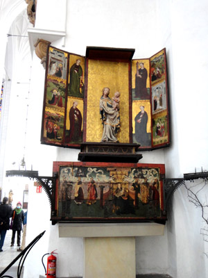 Podobnie przynajmniej kilku kolejnych ołtarzy m.in. św. Adriana. Uwagę zwiedzających przyciąga też Tablica Dziesięciorga Przykazań, z lat 1480-1490, z malowanymi scenami cnót i przywar. No i zegar astronomiczny z ciekawą historią oraz dosyć ponurą legendą.