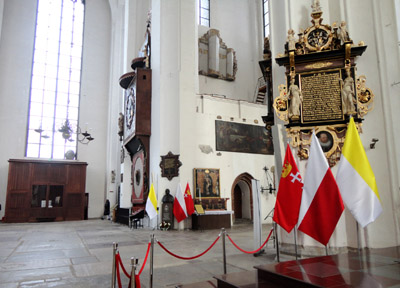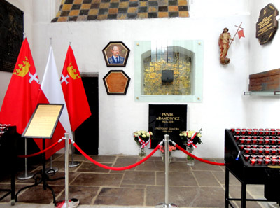 W bazylice pochowany został również, zamordowany w 2019 roku, prezydent Gdańska Paweł Adamowicz. Ale jego tablica poniżej szczątków wmurowanych w ścianę świątyni i umieszczony obok sześcioboczny portret trumienny w stylu staropolskim, nie rażą.