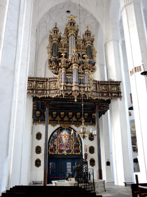 Zaś w farze zachowano w większości dawny wystrój. W tym, rzecz rzadka w świątyniach protestanckich, w świątyniach protestanckich, ołtarze. Gotyckich zachowało się aż do II wojny światowej 28 i było ich wówczas w jednej świątyni najwięcej w świecie. W okresie luterańskim, czyli aż do roku 1945, zamalowano tylko na biało katolickie freski i inne malowidła ścienne.