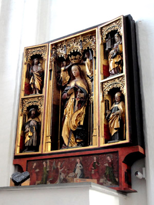 Odnowiony ostatnio ołtarz główny poświęcony Koronacji Marii, to poliptyk z lat 1511-1517 wykonany przez Mistrza Michała z Augsburga i jego warsztat. Składa się z korpusu oraz trzech par skrzydeł: jednej rzeźbionej i dwu malowanych.