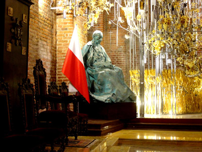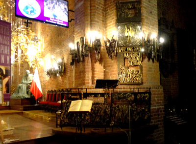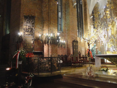 Korony Marii i Dzieciątka poświęcił w 2001 roku Jan Paweł II. Po obu stronach tego obrazu stoją figury patronek Europy: św. Brygidy Szwedzkiej i św. Elżbiety Hesselblad. Na górze ołtarza, pod sklepieniem prezbiterium, biały orzeł zrywa się do lotu.