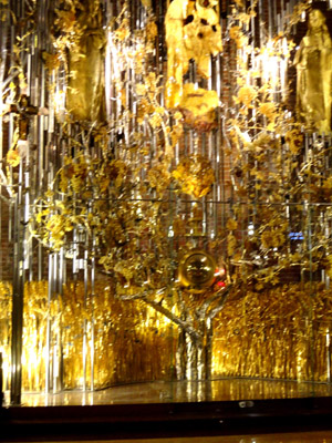 Uwagę przyciąga jednak przede wszystkim bursztynowy ołtarz główny. Oglądam go po raz pierwszy, gdyż poprzednio bywałem w tym kościele jeszcze przed zbudowaniem tego ołtarza. Obecnie jestem wieczorem, trafiając na moment, gdy jest on przez chwilę w pełni oświetlony. Robi spore wrażenie.