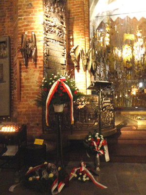 Drzwi z brązu z 152 postaciami ważnymi w historii „Solidarności”. Płaskorzeźby: Matki Bożej w sukni z herbami miast polskich i bł. Jerzego Popiełuszki. Urny z ziemią z miejsc polskiej martyrologii: obozów koncentracyjnych i miejsc straceń. Epitafia przypominające Rzeź Wołyńską, Zbrodnię Katyńska, Żołnierzy AK, T.O.W. „Gryf Pomorski”, cichociemnych oraz także NSZ i WiN.