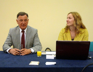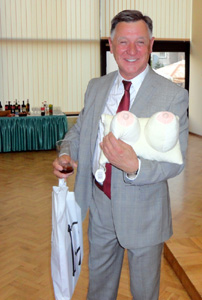 Było to więc ciekawe i pouczające spotkanie, po zakończeniu części oficjalnej którego prezes naszego stowarzyszenia Sławek Bawarski podarował inż. Bogdanowi Pęskiemu album oraz żartobliwą poduszkę ( na zdjęciu ) przydatną w podróży samolotem bądź autokarem. Bo i on, wraz z obecną na spotkaniu żoną, lubi tak jak i my zwiedzać świat.
