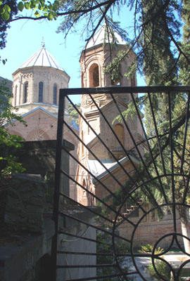 Schodząc z Panteonu na dół, do centrum miasta biegnącą zakosami drogą, oglądam w przerwach w zieleni jego widoki. Zaś odwracając się w kierunku ciemnej, gdyż popołudniu oświetlona jest z drugiej strony, Świętej Góry, widzę wyłaniającą się wśród konarów drzew kopułę Mama Dawiti, a nad nią wieżę TV.