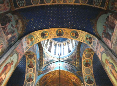 Podobne ikony, duże i w srebrnych koszulkach, ozdabiają także ściany boczne. Ich górne partie oraz strop pokrywają freski namalowane w latach 1850-1860 przez rosyjskiego malarza Grigorija Gagarina i odnowione w 2012 roku. Nie brak również zwykłych, malowanych ikon.