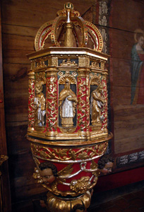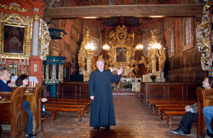 Wystarczy jednak przekroczyć próg tego kościoła aby znaleźć się w innym świecie. I oniemieć na widok kapiących od złoceń barokowych ołtarzy, chrzcielnicy, obrazów, figur świętych. Wspaniałej późnogotyckiej rzeźbionej grupy Ukrzyżowania na belce tęczowej łączącej ściany i jak gdyby oddzielającej nawę od prezbiterium.