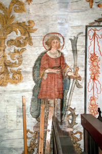 O kilkakrotnie na przestrzeni wieków ozdabianych ścianach i stropie metodą nakładania jednego fresku na drugi lub poprawiania ich, bądź nawet… nakładania na nie, jak w trakcie remontu w latach 1856 – 1858, grubej warstwy tynku, aby zamaskować wybrzuszenia i nierówności ścian. Dopiero współczesne prace konserwatorskie pozwoliły, w latach 2000 – 2002, sukcesywnie odsłonić niektóre ze starych malowideł.