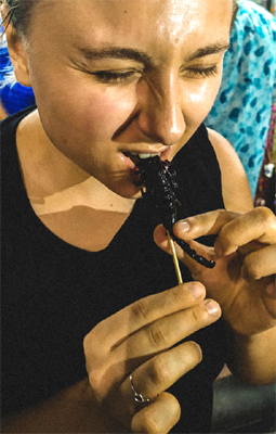 Ale już bez problemów jadałem węże czy żmije, zwłaszcza jako „zakąskę” do, podłej zresztą, chińskiej wódki, skorpiony z grilla w Chinach, czy Tajlandii, lub wysmażoną w oleju i wysuszoną, przypominającą chipsy, szarańczę, sprzedawaną w Meksyku na bazarach na wagę. Ale to już inny, obszerny temat, podobnie jak jazda, której trzeba było spróbować chociaż raz: na wielbłądach, słoniach, osłach, mułach – o koniach nie wspominam, a nawet… strusiach.