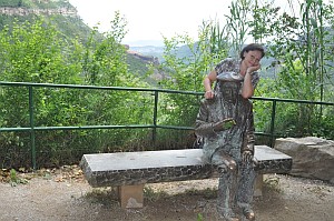 W soboty i niedziele przybywają tu Katalończycy z całym prowiantem i w miejscach piknikowych, przy dużych rodzinnych stołach biesiadują. W ruch idą grille, w lodówkach chłodzą się napoje, przede wszystkim wino, którego nie pija się chyba tylko do śniadania. Obiad i kolacja bez wina to dla Katalonczyków sprawa prawie nie do wyobrażenia. Dziś jednak oprócz nas nie ma tu nikogo, możemy więc do woli cieszyć się pięknem natury. Naszą samotność przerywa… kamienna figura mężczyzny siedzącego na ławce.