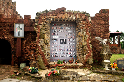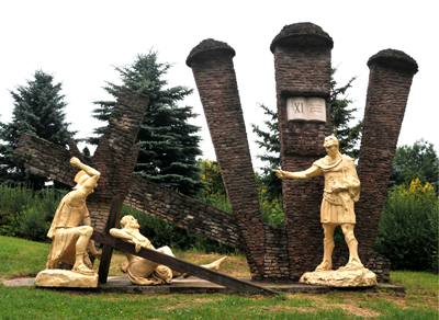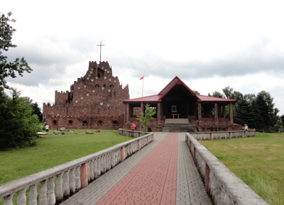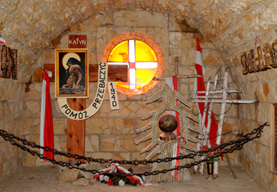 Natomiast po prawej stronie przed wejściem do Golgoty wszystkie ofiary upamiętnia, z ich fotografiami, wybudowana z odłamków skał nisza, przed którą na postumencie orzeł biały rozpościera skrzydła. 33 metrowej wysokości Golgota przypominająca, jak już wspomniałem, średniowieczną twierdzę, jest plątaniną kaplic upamiętniających martyrologię narodu polskiego, przejść i schodów.