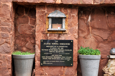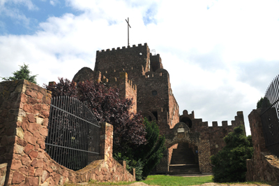 Po prawej stronie drogi nagle wśród zieleni konarów drzew wyłania się kamienna, szaro – ceglasta budowla. Ni to średniowieczne zamczysko, ale niepodobne do znanych w Polsce, ni to jakieś ruiny. Dopiero po przejechaniu kilkunastu metrów dalej widać z drugiej strony, że fasada tej budowli pokryta jest ponad dwudziestoma tarczami z białymi orłami. Z różnych okresów naszej historii. Najstarszy, na dole po lewej stronie, wzorowany na rewersie srebrnego denara Bolesława Chrobrego, określanego w numizmatyce nie jako Orzeł, lecz Ptak. Pozostałe to regionalne, książęce i królewskie różnych polskich władców.