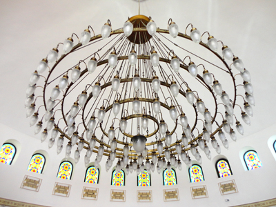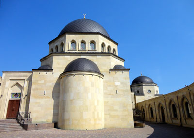 Zbudowany z jasnego kamienia, z tradycyjną, wielką bramą z ostrołukowym, zdobionym wejściem i kilkoma stalowo – czarnymi kopułami, gdyż nakryte są nimi również inne budynki kompleksu, jest efektowny. Wnętrze głównej sali modłów i pozostałych pomieszczeń są skromne, jasne, z wielkimi żyrandolami oraz podłogami pokrytymi ogromnymi dywanami.
