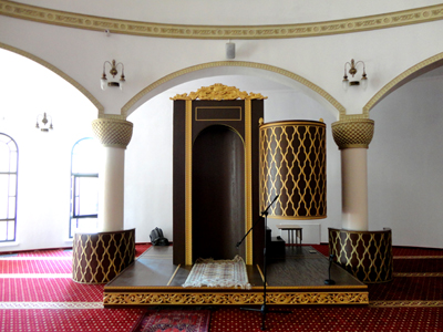 W meczecie są trzy duże sale, pokrywają go dwie duże kopuły, a stojący obok, wzniesiony na planie sześciokąta minaret z balkonikiem na górze, nakrywa strzelisty dach z półksiężycem na szczycie. Z zewnątrz, od strony ulicy, od której kompleks ten jest nieco cofnięty, meczet otaczają półkoliście budynki medresy – seminarium duchownego oraz centrum kultury.
