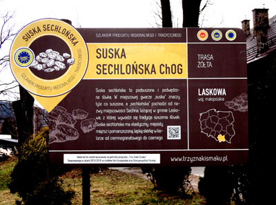 W tym regionie kraju słynącym z upraw śliwek i innych owoców popularne było suszenie, a właściwie ich wędzenie w dymie, i to już od XVIII w. Śliwki takie nadal nazywane są suskami, o czym przypomina inna tablica kolo wspomnianego dworu, poświęcona Suskom Sechlońskicm i szlakowi turystycznemu produktów regionalnych i tradycyjnych.