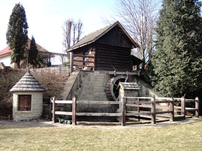 „Typowy dla tego regionu młyn wodny, jakich w okolicy jeszcze na początku ubiegłego wieku było wiele. W samej Żmiącej na niewielkim górskim potoku płynącym przez wieś było ich aż 25. Przeniesiony do skansenu młyn jest ostatnim zachowanym młynem posiadającym w całości drewniany mechanizm napędowy. Zamontowany pytel pozwalał na uzyskiwanie mąki dobrej jakości (od niego pochodzi – uwaga moja – nazwa, jaką pamiętam z dzieciństwa, wysokiej jakości mąka pytlowa) pozbawionej zanieczyszczeń. Stąd tradycyjnie w tym młynie zamawiano mąkę na szczególne okazje jak wesela czy chrzciny. Wewnątrz młyna znajduje się ponadto ekspozycja narzędzi do mielenia i obróbki zboża jak żarna, stępy i stępki oraz wyplatane z łyka sita do przesiewania mąki czy kaszy.”