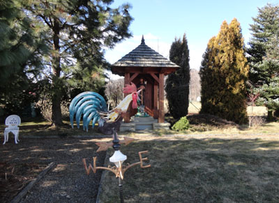 Te dwie ostatnie wykonano z połączenia drewna z korą. Malowniczo położony, niewielki skansen, wzbogacają dwie zabytkowe przydrożne kapliczki, w tym jedna z figurą świętego, druga Chrystusa Frasobliwego. Obok pierwszej z nich widzę i fotografuję ludowego, metalowego i malowanego, piejącego koguta na wskaźniku wiatru.
