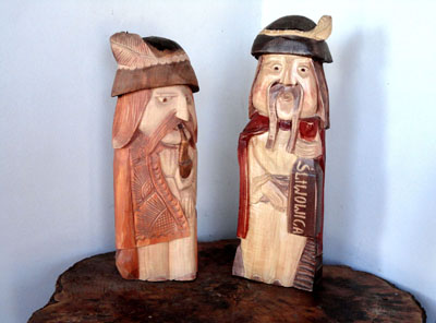 Nie brak również, urozmaicających zwiedzanie, rozmieszczonych na terenie skansenu lub koło budynków, drewnianych oraz malowanych figurek i rzeźb współczesnych. Chłopów i gospodyń wiejskich w strojach z epoki, z kosą, cepami, koszących zboże sierpami, z nosidłami na wodę, a także praczki oraz prządki. Czy chłopa orzącego drewnianą sochą z „krowim napędem” prowadzonym przez kobietę. Z przyjemnością oglądam barwną parę gospodarzy, z których jeden trzyma butlę śliwowicy, zakochaną parę i chyba pasterza lub wędrowca.