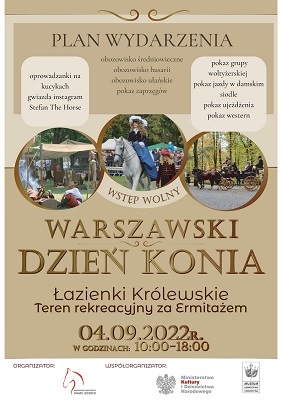 Łazienki Królewskie zapraszają na „Warszawski Dzień Konia” organizowany przez Warszawsko-Mazowiecki Związek Jeździecki, który odbędzie się 4 września 2022 roku od godziny 10:00 na terenie rekreacyjnym za Ermitażem.