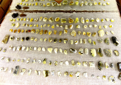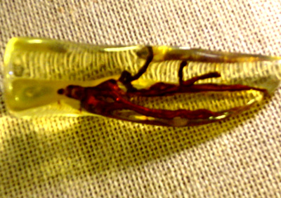 Zatopione w żywicy – bursztynie owady, nasiona i fragmenty ówczesnych roślin. Przy czym nie tylko w bursztynach bałtyckich, ale również m.in. w kopalu kolumbijskim. Mniejsze egzemplarze umieszczono pod dużymi szkłami powiększającymi pozwalające zapoznać się ze szczegółami.