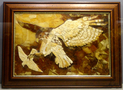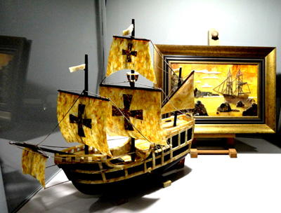 W innym miejscu Drapieżny ptak porywający mniejszego, Para rycerzy na koniach, walczących na miecze, wykonana z bursztynu o dwu kontrastowych kolorach. I kilka innych. Ale również żaglowiec z czasów wielkich odkryć geograficznych zestawiony z obrazem, także wykonanym z bursztynu, panoramą skalistego wybrzeża z dwumasztowym żaglowcem.