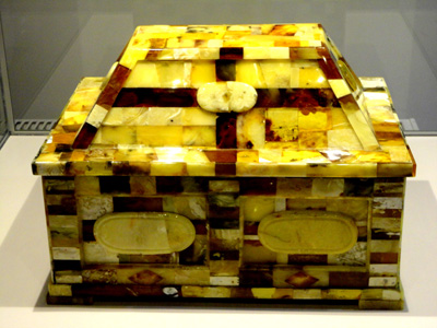 Czy wykładana płytkami bursztynu duża szkatułka. Nie brak ładnej biżuterii z dużymi i mniejszymi bursztynami, m.in. oprawionymi ciekawie w srebro. W innych gablotach widzę także, i fotografuję, dużego, ceramicznego zwierza przypominającego tygrysa.